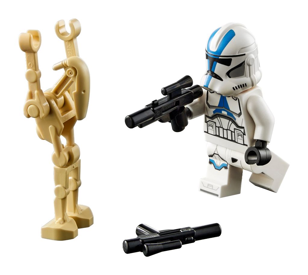 Figurki: Czterech żołnierzy-klonów z 501. legionu (z czego jeden z plecakiem odrzutowym), dwa Droidy bojowe